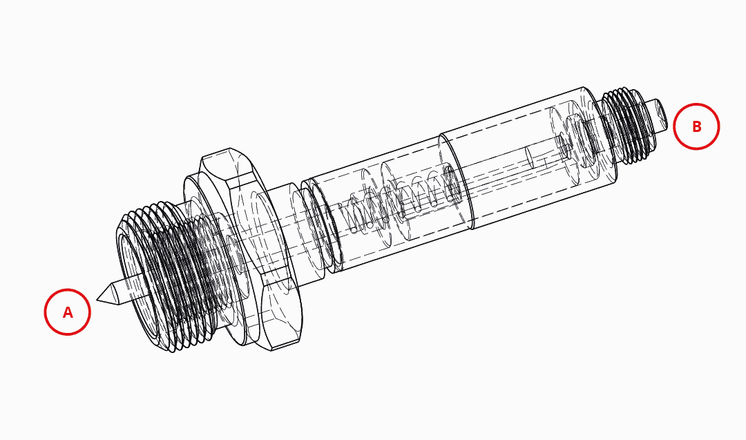 Под воздействием тока подвижный якорь внутри трубки приходит в движение, толкая элемент, с которым он соединен.